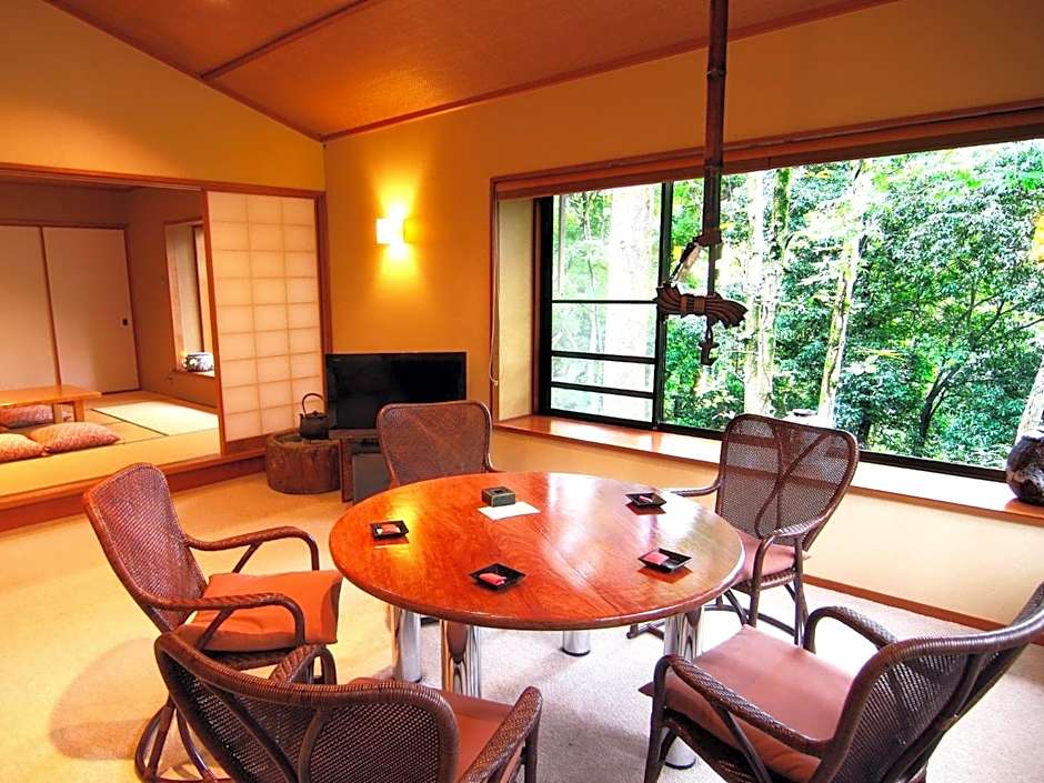 The twin room offers air conditioning, tatami, a balcony with garden views as well as a shared bathroom featuring a bidet. The unit offers 3 futons.